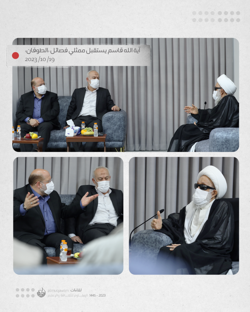 التقى سماحة آية الله الشيخ عيسى أحمد قاسم بوفد من المقاومة الإسلامية الفلسطينية، ممثلاً في ممثل حركة حماس الدكتور خالد القدومي، وممثل حركة الجهاد الإسلامي ناصر أبوشريف، اليوم الخميس (19 اكتوبر 2023).
