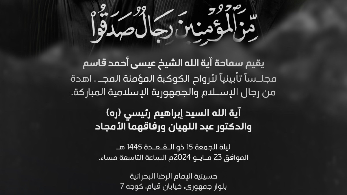 يُقيم سماحة آية الله الشيخ عيسى أحمد قاسم مجلسًا تأبينيًا لأرواح الكوكبة المؤمنة المجـاهدة من رجال الإسلام والجمهورية الإسلامية المباركة، آية الله السيد إبراهيم رئيسي (ره) والدكتور عبد اللهيان ورفاقهما الأمجاد – ليلة الجمعة ١٥ ذو الـقـعـدة ١٤٤٥ هـ الموافق ٢٣ مـايـو ٢٠٢٤م – الساعة التاسعة مساءً ويوجد مكان خاص للنساء بحسينيّة الإمام الرِّضا البحرانيّة – قم المقدسة