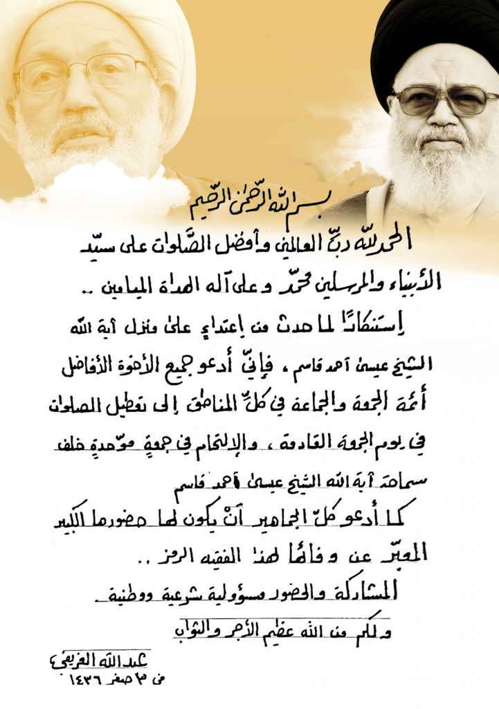 وقال العلامة الغريفي في رسالة خطية لعموم أبناء شعب البحرين: “استنكارًا لما حدث من اعتداءٍ على منزل آية الله الشيخ عيسى أحمد قاسم، فإنّي أدعو جميع الأخوة الأفاضل أئمة الجمعة والجماعة في كلِّ المناطق إلى تعطيل الصلوات في يوم الجمعة القادمة، والإلتحام في جمعةٍ موحّدةٍ خلف سماحة آية الله الشيخ عيسى أحمد قاسم”.
