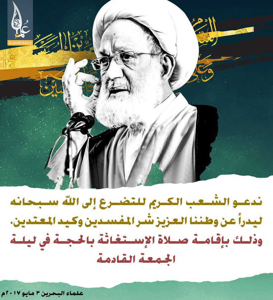 وهنا ندعو الشعب الكريم للتضرع إلى الله سبحانه ليدرأ عن وطننا العزيز شر المفسدين وكيد المعتدين، وذلك بإقامة صلاة الإستغاثة بالحجة في ليلة الجمعة القادمة.
