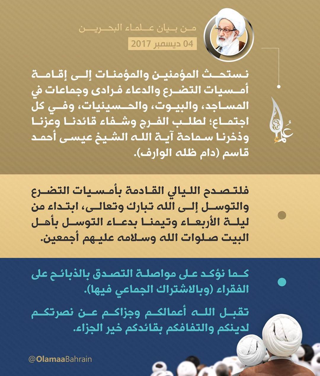 نستحث المؤمنين والمؤمنات إلى إقامة أمسيات التّضرع والدُّعاء فرادى وجماعات في المساجد، والبيوت، والحسينيات، وفي كلِّ اجتماع؛ لطلب الفرج وشفاء قائدنا وعزّنا وذخرنا سماحة آية الله الشيخ عيسى أحمد قاسم (دام ظلّه الوارف).