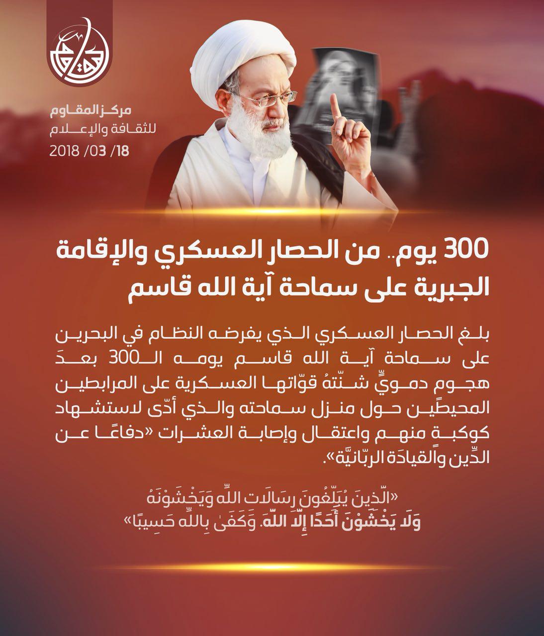 المقاوم للثقافة والإعلام : بلغ الحصار العسكري الذي يفرضه النظام في البحرين على سماحة آية الله قاسم يومه الـ 300 بعدَ هجوم دمويًّ شنّتهُ قوّاتها العسكرية على المرابطين المحيطين حول منزل سماحته والذي أدّى لاستشهاد كوكبةٍ منهم و اعتقال وإصابة العشرات <<دفاعاً عن الدين والقيادَة الربّانيَّة>>.