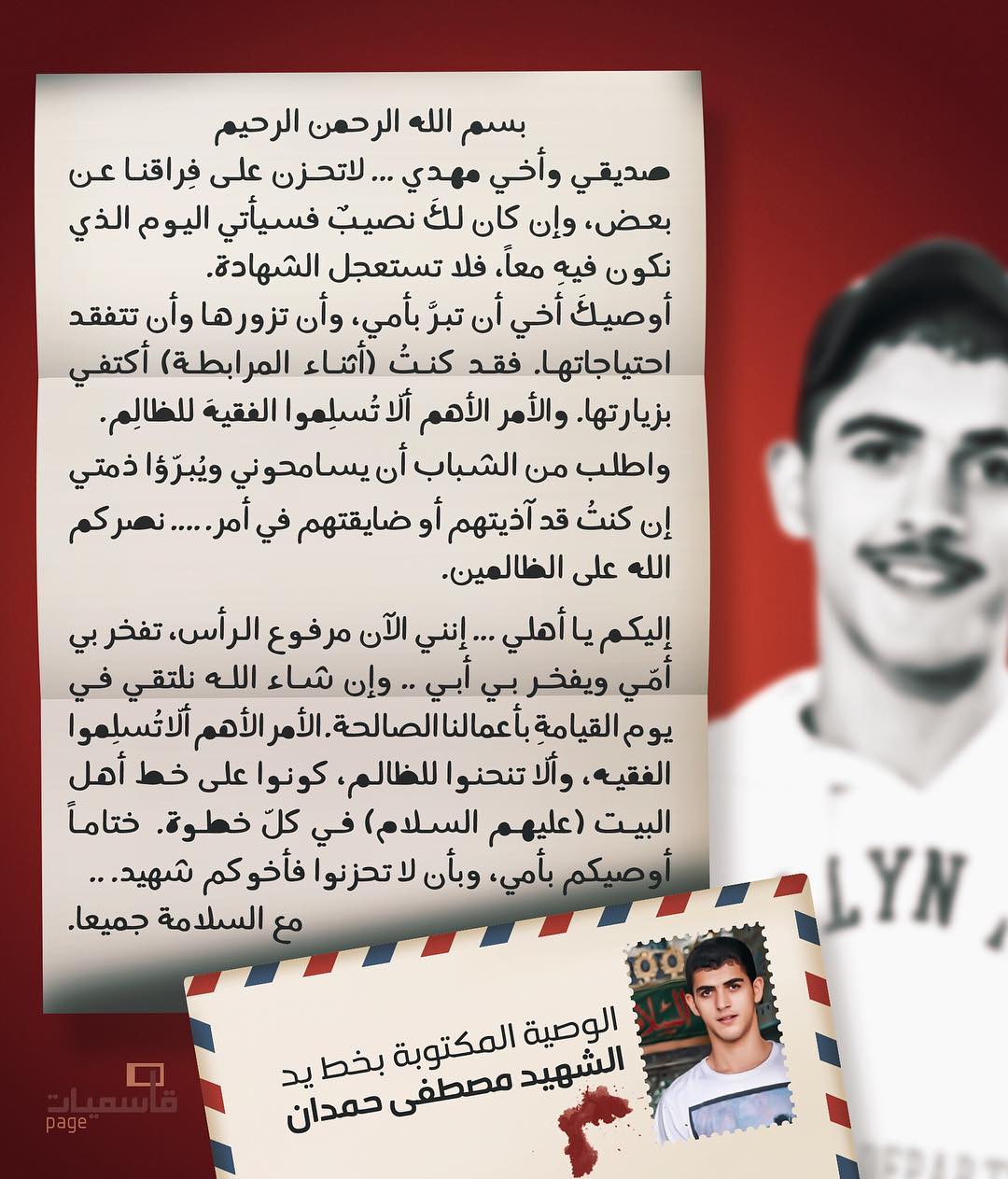 نشرت عائلة الشهيد السعيد مصطفى حمدان وصيته التي خطّها بيده لأهله، ولأصدقائه جاء فيها: