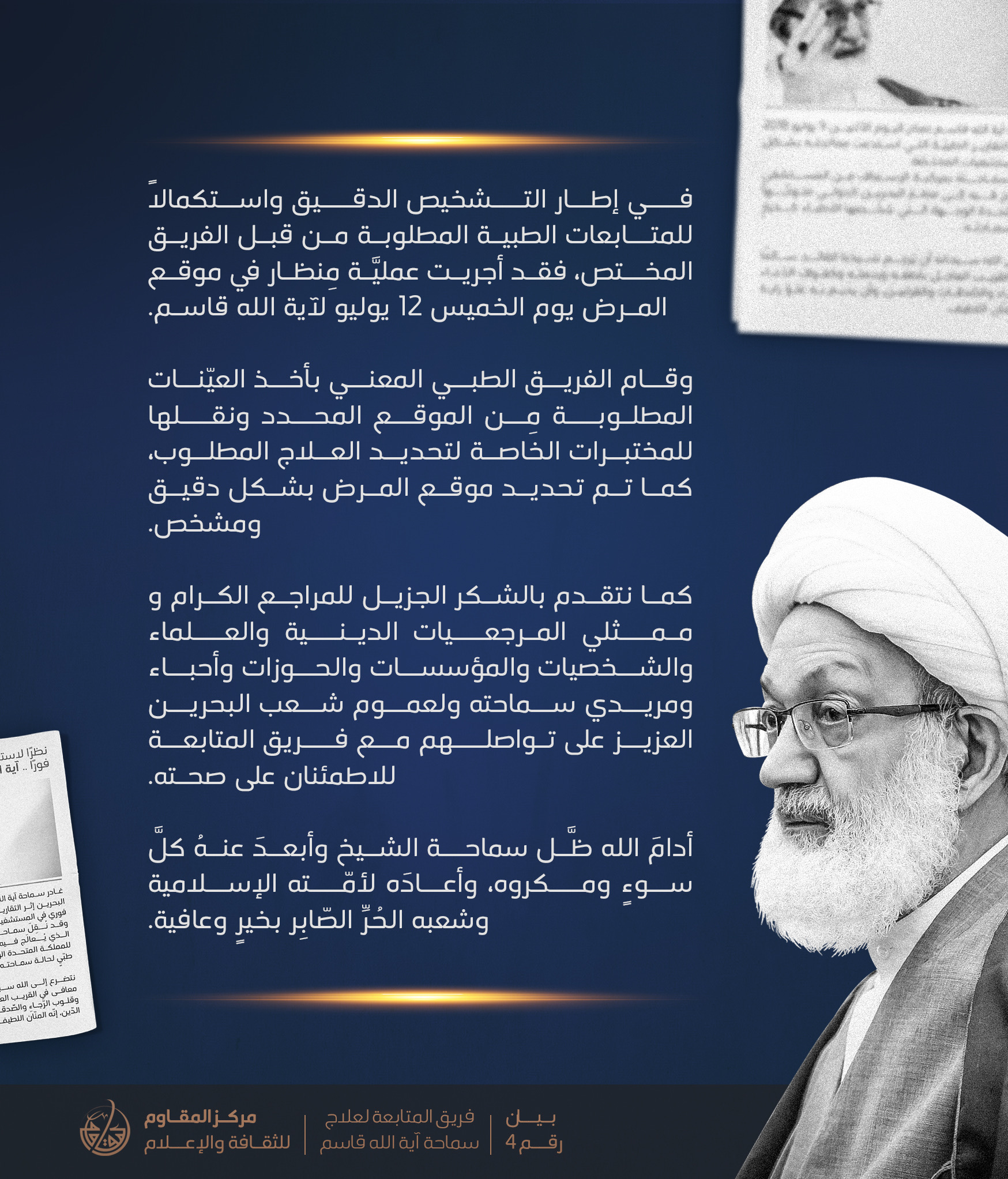 في إطار التشخيص الدقيق واستكمالاً للمتابعات الطبية المطلوبة من قبل الفريق المختص، فقد أجريت عمليَّة مِنظار في موقع المرض يوم الخميس ١٢ يوليو لآية الله الشيخ عيسى قاسم.
